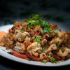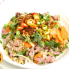 chicken salad with lemon juice & herb topped with crushed peanuts & crisp onion